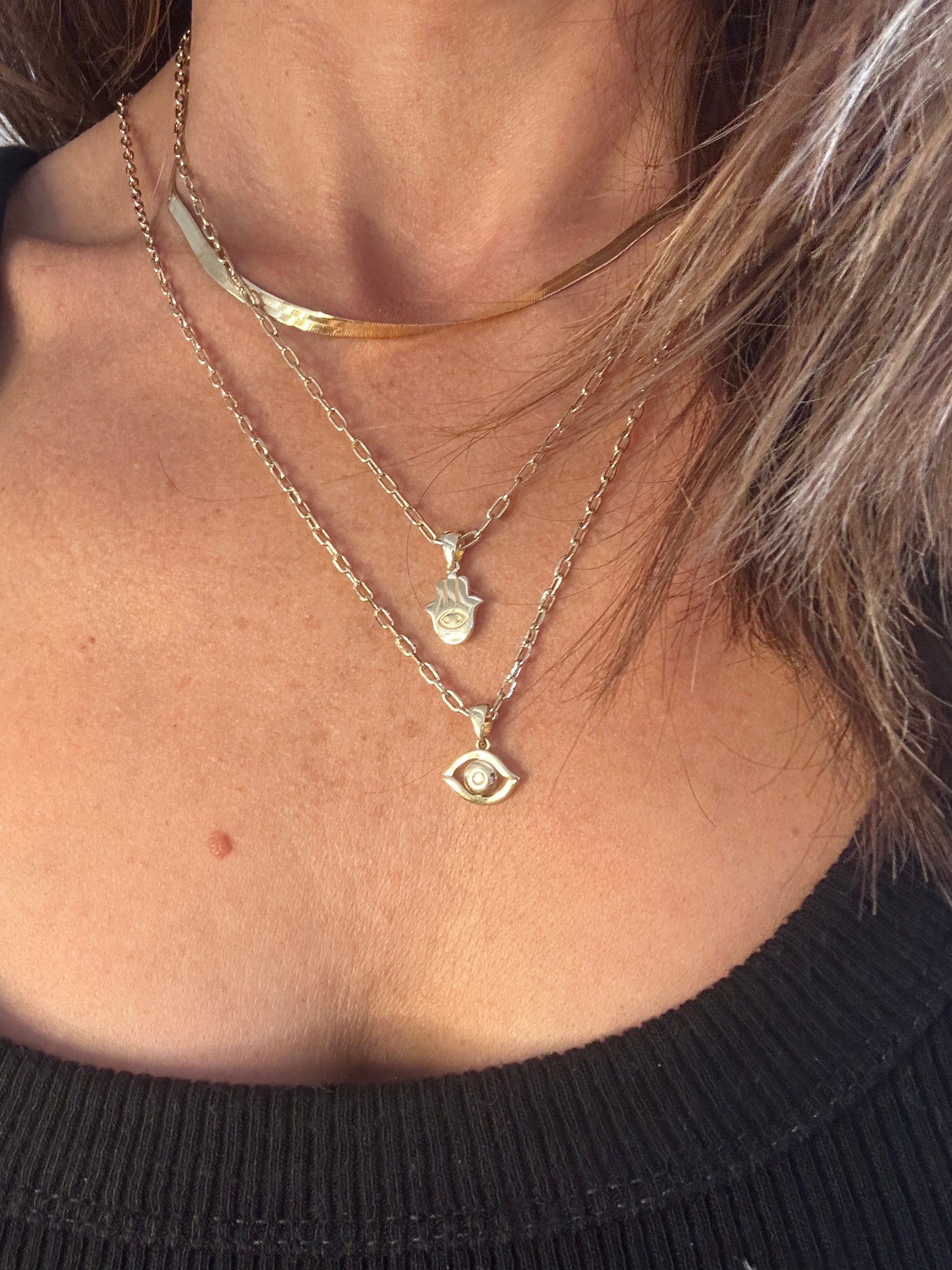 The palm-shaped amulet originated in the Middle East and North Africa and has become a much loved jewellery motif. It symbolises the Hand of G_d and is a sign of protection. It has properties of happiness, luck, health and good fortune.