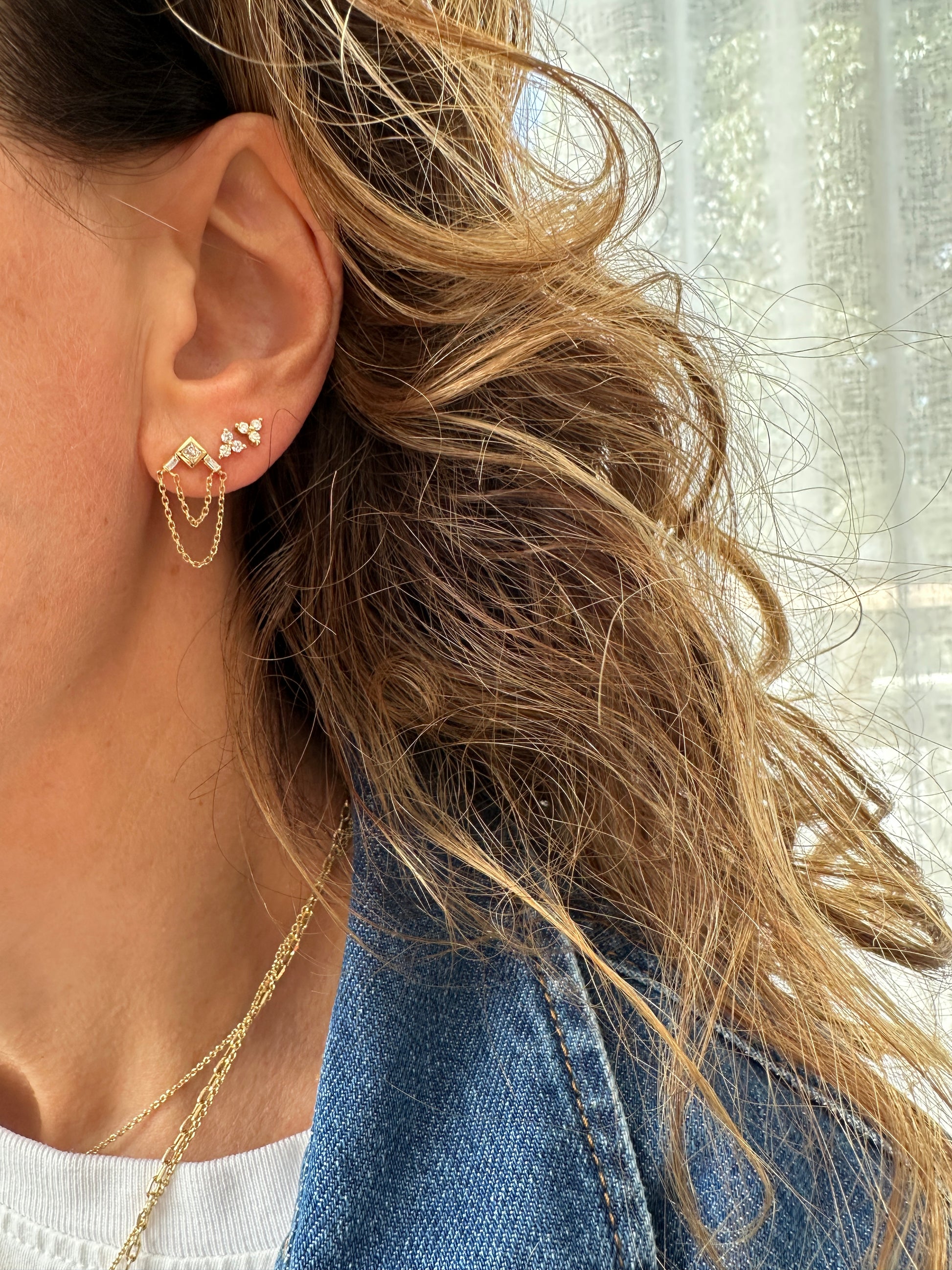 A sleek balance of modern geometry and delicate movement, these earrings feature a trio of diamonds arranged in the shape of a refined arrow. At the center, a brilliant princess-cut diamond is flanked by two baguette diamonds, creating a sharp, elegant point. From the arrow’s tip, two fine chains cascade gracefully, catching the light with every turn of the head. Crafted in 18-carat gold, this design marries clean lines with fluid drape, making it both striking and effortlessly wearable.