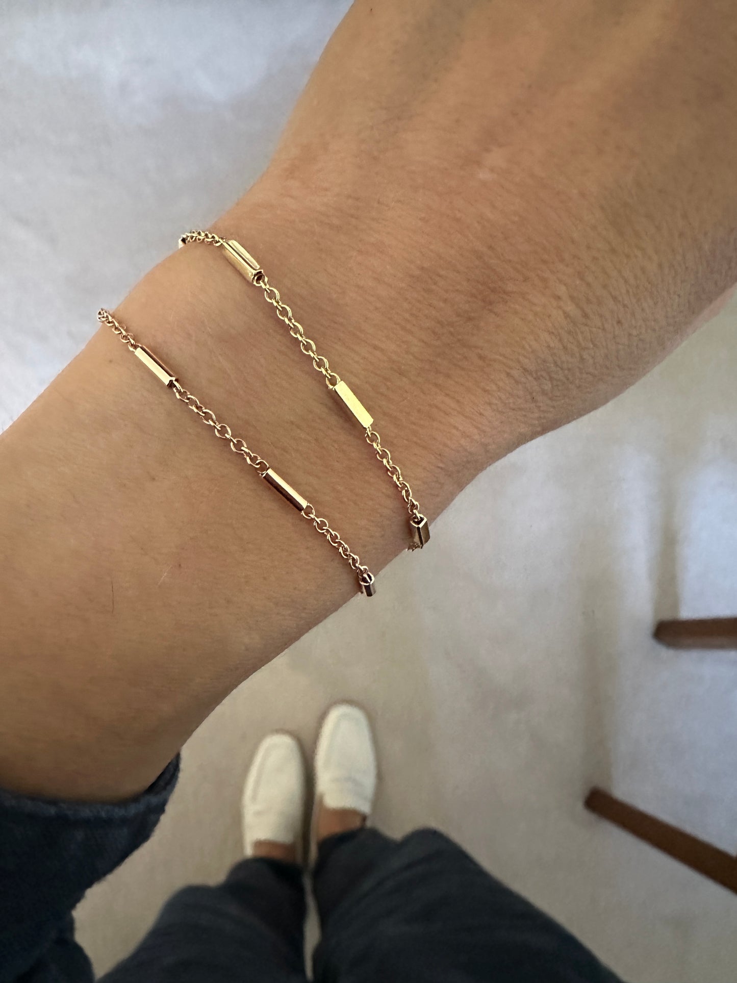 This lovely 18kt yellow gold bracelet features small square tubes interspersed by chain. Gorgeous worn alone or stacked up with any other bracelets to create your own unique look.