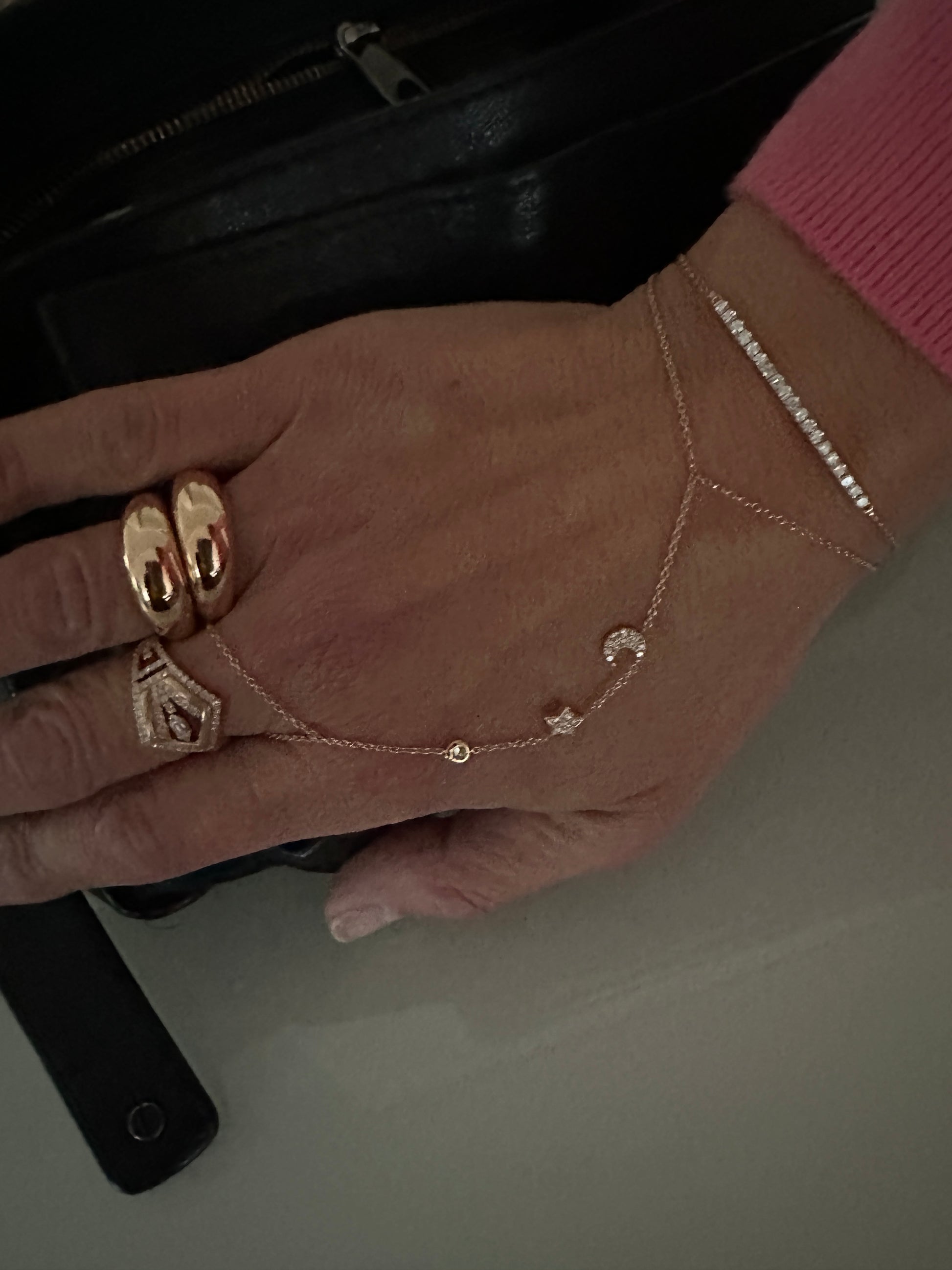 A luminous thread of fine 18kt Rose Gold traces from the wrist to the finger tip forming an elegant bridge between bracelet and ring. The sun the star and the moon shimmer along the chain like the scattered light of the galaxy creating a fluid play of brilliance with every moment.