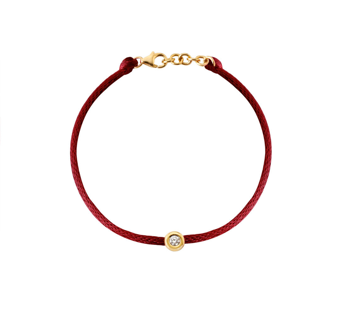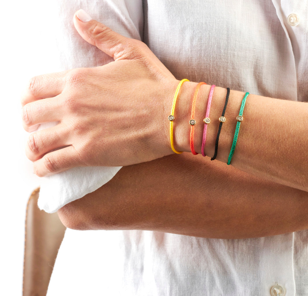 Add some colour to your wardrobe with these easy to wear coloured cord bracelets. Each cord features a brilliant cut diamond set in 18kt yellow gold. The diamond tube moves along the cord and when positioned at the top sits snuggly on the arm. The 18kt yellow gold oyster clasp at the back allows for easy adjustment and extra length if needed. Each colour represents a different attribute, there are 10 all together.