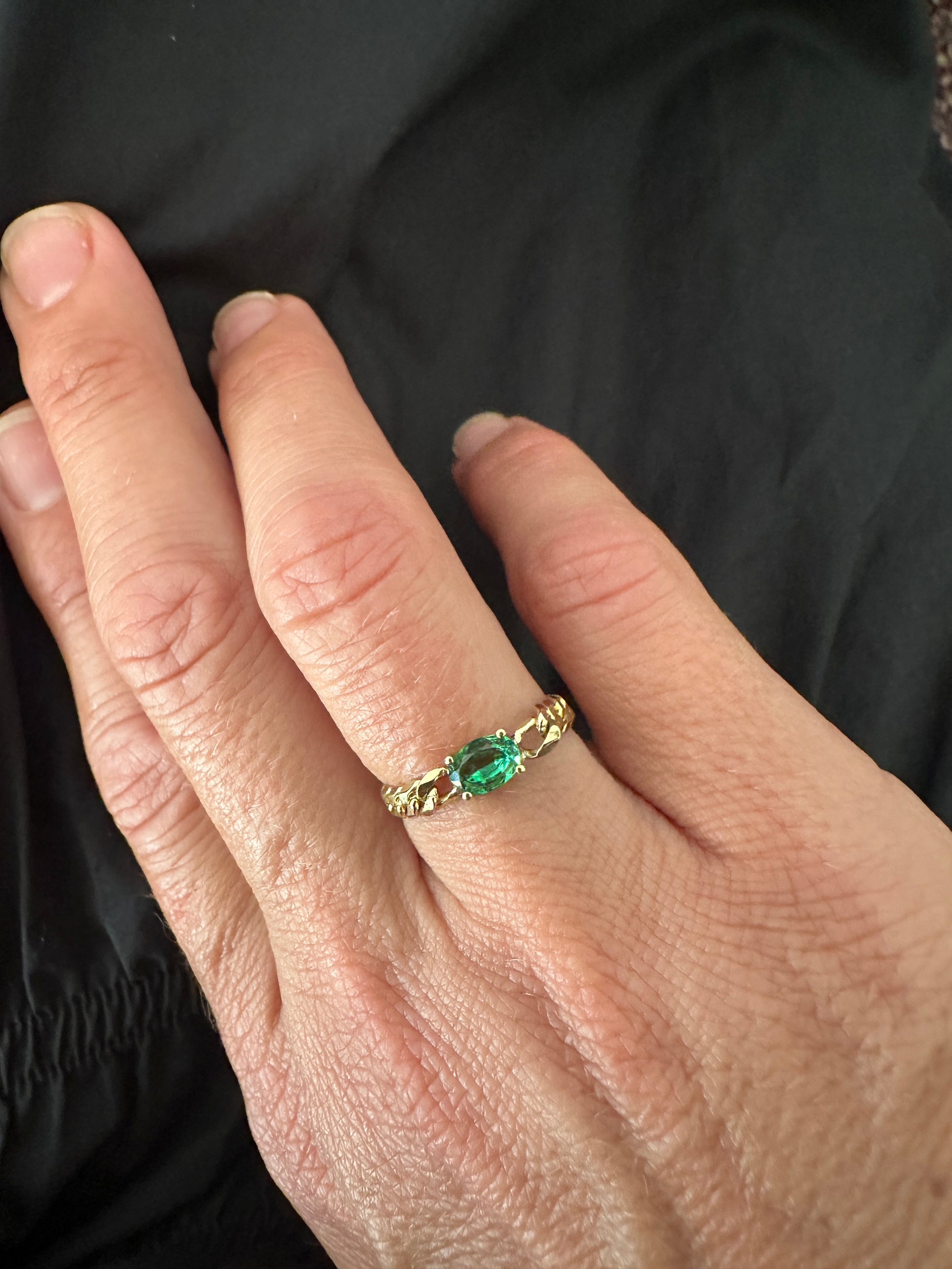 18kt Yellow Gold soft chain ring featuring a green oval shape tsavorite. Tsavorite is a lush green stone, it is believed to be the gem stone that helps one connect with their inner beauty. It promotes confidence, compassion and generosity. It is connected to the heart chakra 💚