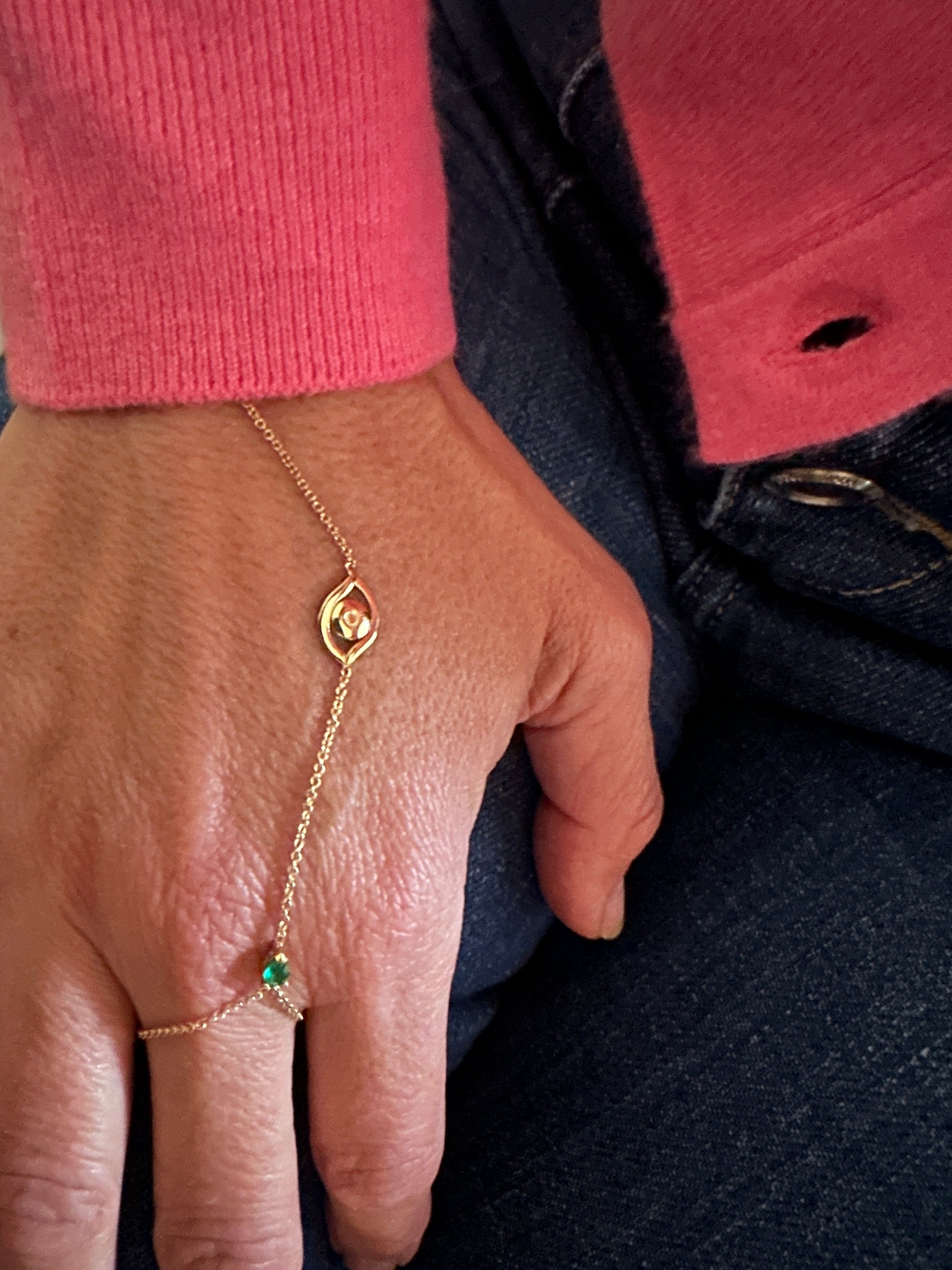 18kt Yellow Gold soft chain ring effortlessly slips onto the finger. With an evil eye motif and pear shape green tsavorite. Forming an elegant bridge between bracelet and ring, the design balances a modern look with a spiritual motif.